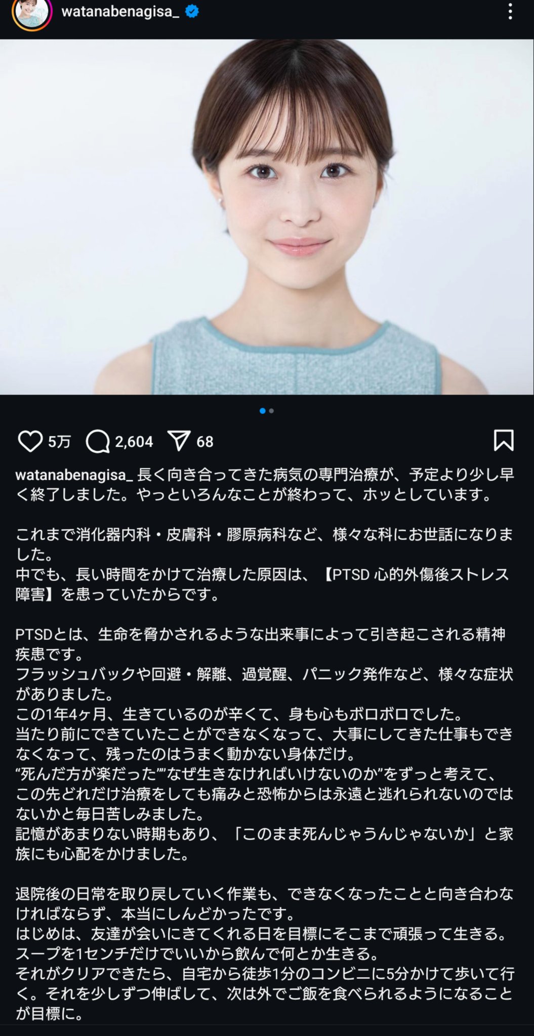 「渡邊さんは療養中にインスタグラムで体調を報告することはありましたが、病名を明*ことはありませんでした。ですが昨年10月に更新したインスタグラムで、《長く向き合ってきた病気の専門治療が、予定より少し早く終了しました》としつつ、PTSD(心的外傷後ストレス障害)を患っていたことを告白。