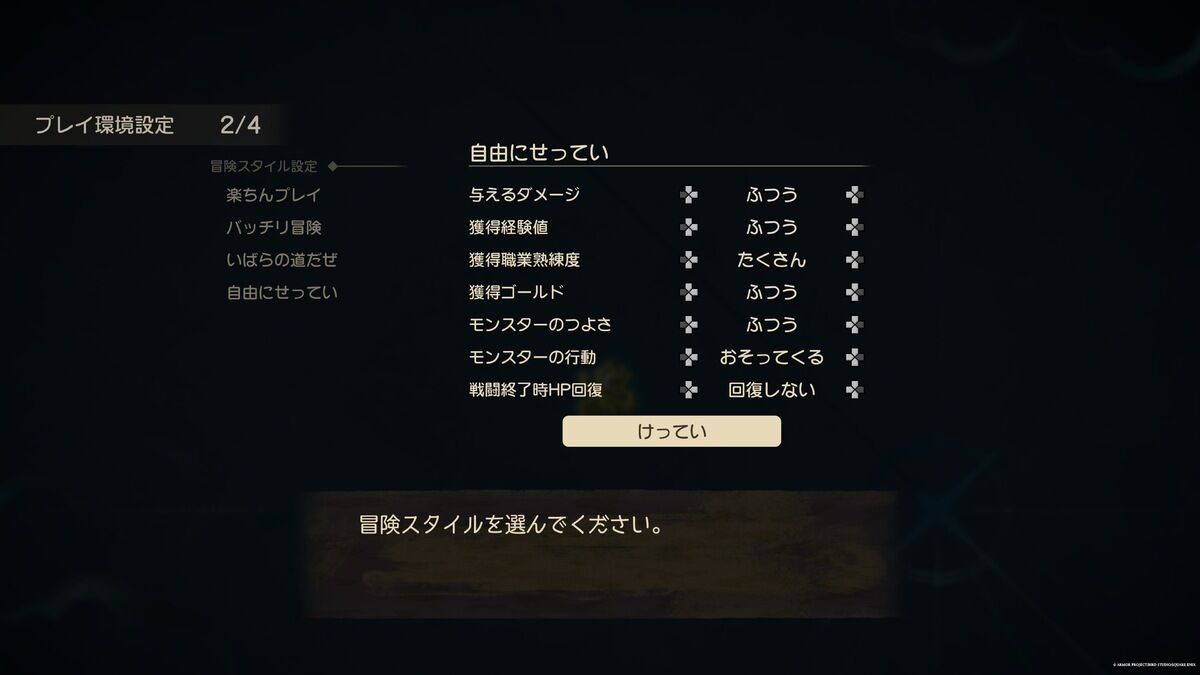 たとえば経験値は少なめにして、職業熟練度は多く獲得できるようにする。モンスターの強さは手強くして歯ごたえのある戦闘を楽しみつつ、経験値も多くしてレベル上げの時間は短縮する。など、自由な冒険スタイルの調整が可能となっている。