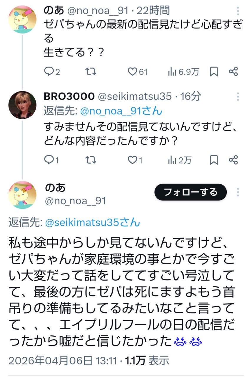 公式Xでは「突然の報告で失礼いたします。ゼパが急逝いたしました」と告知。「急な訃報となってしまったことを本人に変わりお詫び申し上げます。(原文ママ)葬儀におきましては親族のみで執り行いました。故人が生前受け賜りましたご厚誼に深く御礼申し上げます」とつづっていた。